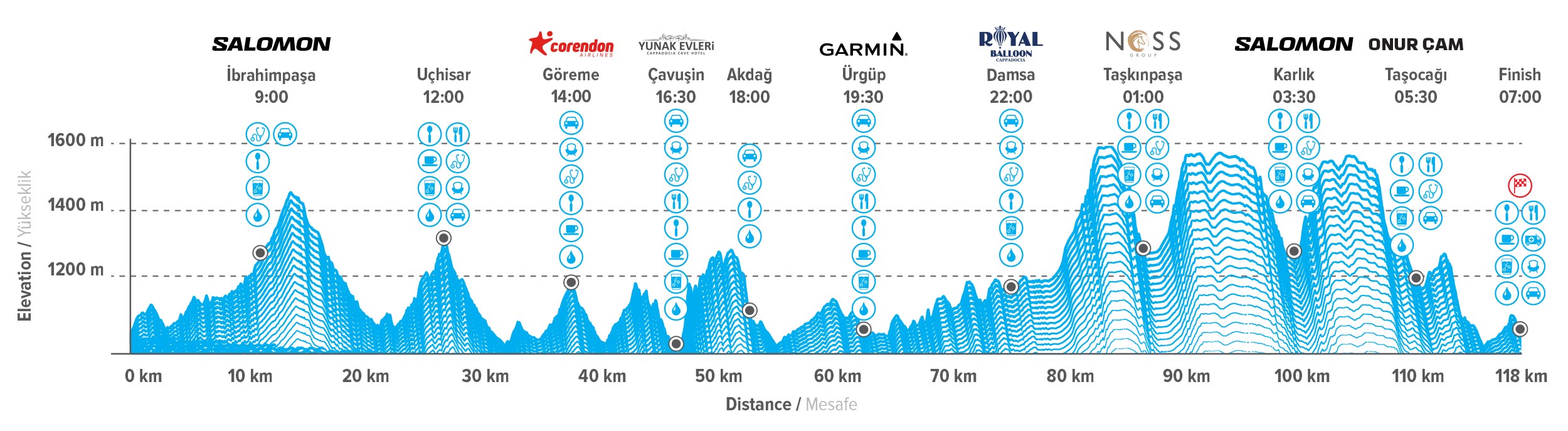 Salomon Cappadocia Ultra-Trail® is an ultra trail run that takes place along the hills and valleys of the unique Cappadocia region, a UNESCO World Heritage site. The distance is about 119 km with a variation in altitude of 3730+ m.