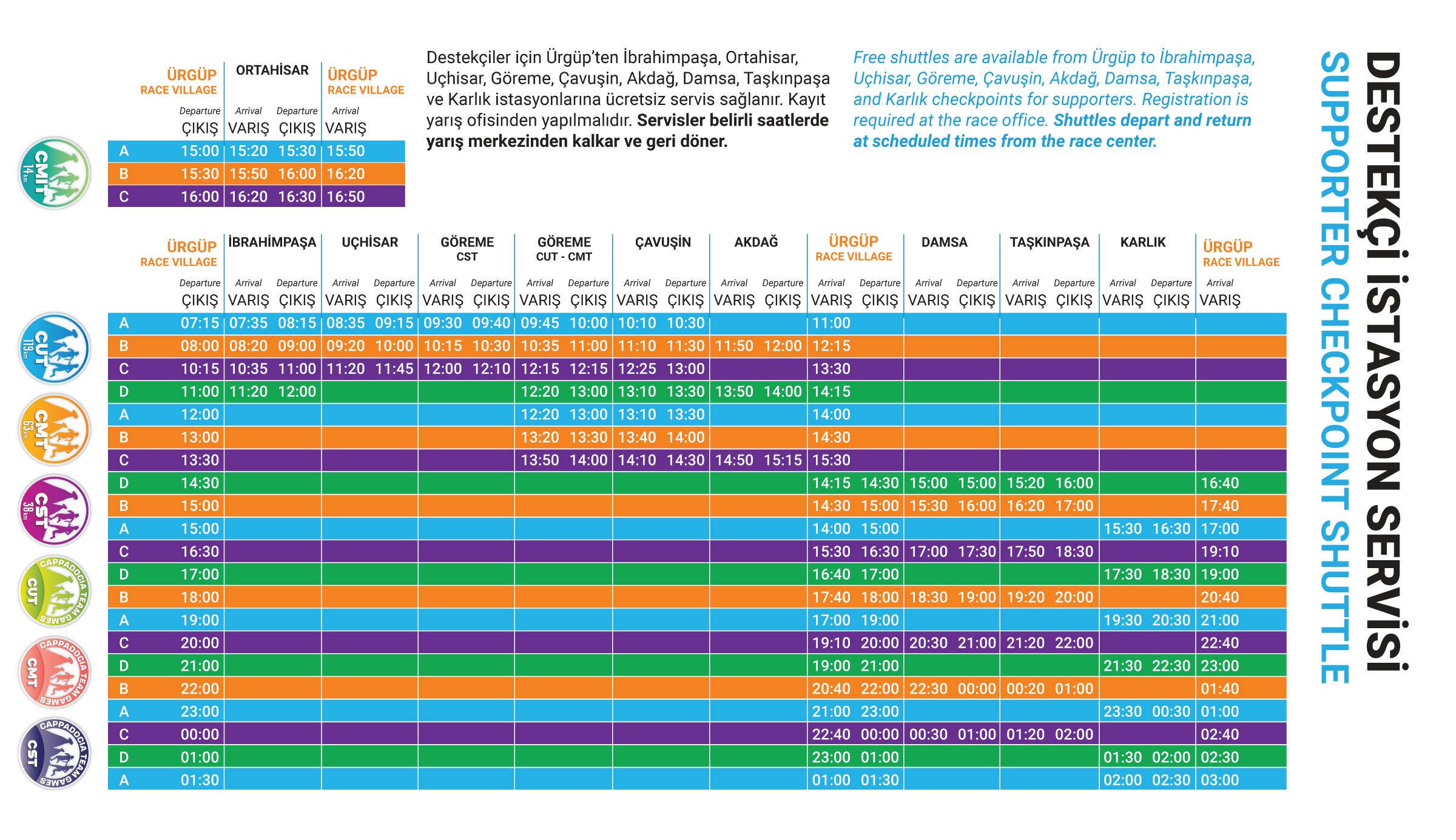 The Urgup checkpoint at 60 km is also a life base. Unlike other checkpoints, there will be a sleeping area. Participants can also collect their deposited bags here. The organization cannot be held responsible for any items left unattended in or outside of the bag deposit area.